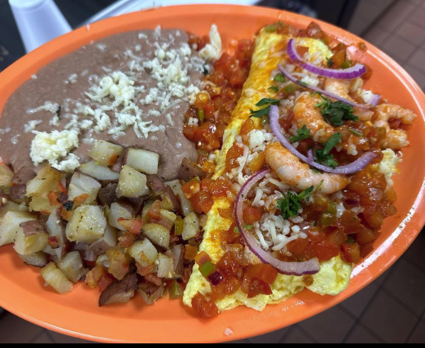 Omelet with shrimp and salsa. Served with beans and potatoes.
